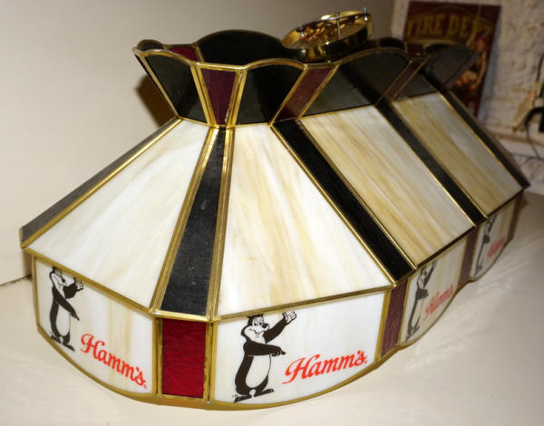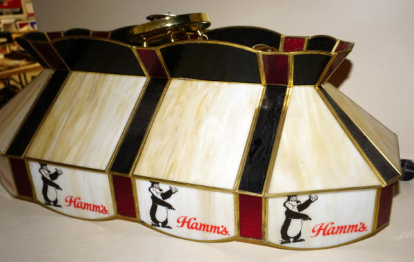 3' long, 16" wide, leaded glass with the 1980's bear logo on the panels; was wired direct, so we did not test, could use a detailed cleaning, but glass all looks good; we have never seen or sold one of these and I think the only Pool Table light ever offered by Hamm's; no shipping, local pickup only