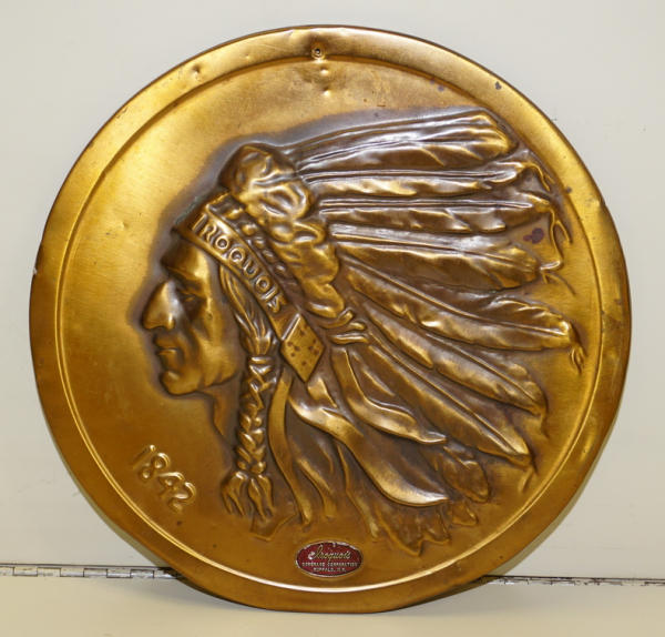 12" across, masonite backing, has some dings and wear, but still a neat piece