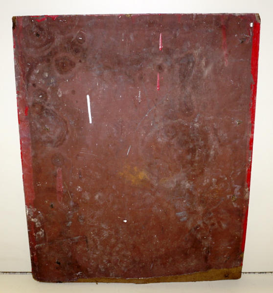 18"x21", has some barn paint on the edges, warped from moisture and heavy wear, as-is, but has a good look