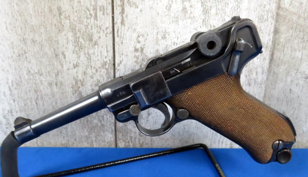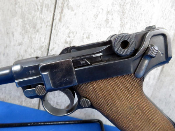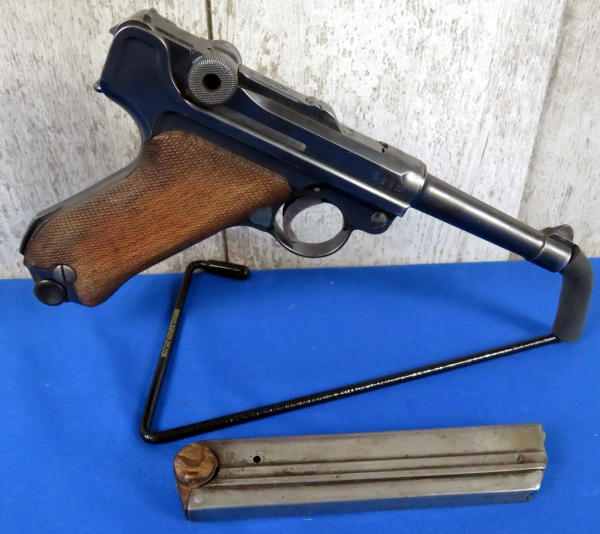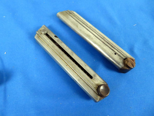 too find a single matching numbers magazine is rare, but to find two is almost unheard of! 4" BBL; bluing has some spots of thinning; gun & both magazines appear to be all #'s matching; has DWM script on top; wood checkered grips; early SN# of 876;
