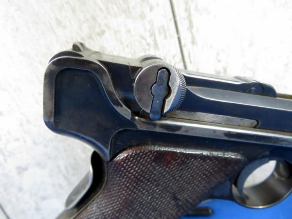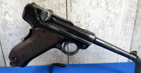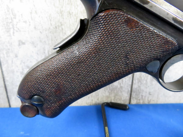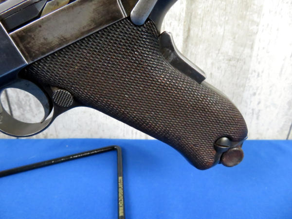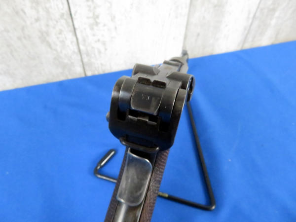 4.75" BBL; some bluing finish loss on spots; wood checkered grips; American Eagle crest is stamped over the chamber; there were approx. 11,000-12,000 of these marked "GERMANY" below the SN#; one magazine; all #'s matching; magazine is not a #'s matching; early toggle & grip safety; SN#10871