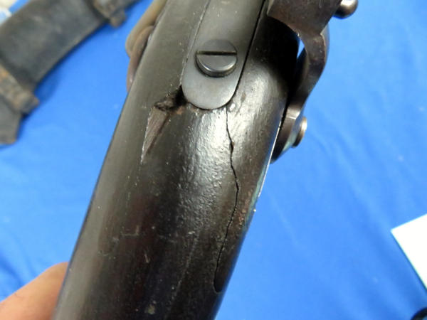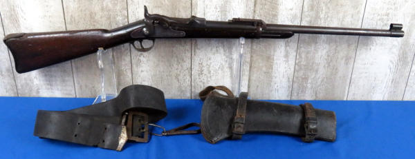 22" BBL; mech works properly; globe front sight; wood is overall nice but does have some damage on top of stock behind top tang; has correct saddle ring on left side of stock; includes an extremely rare Calvary saddle holster and original period correct sling; Front & rear sight protectors w/long rang flip-up front sight and windage correction knob; includes a CMP hard case; this makes a wonderful set with the gun, case, holster & sling! SN#381399; no Transfer needed
