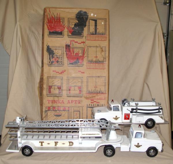 Toys are nice originals, both about 90% condition or so, Box has both pieces, but shows quite abit of wear, no box liner, one of the hardest Tonka sets to find!