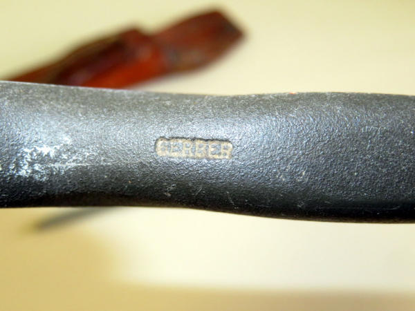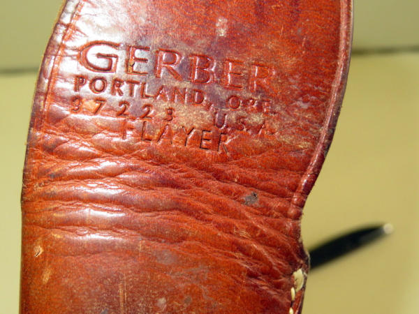 metal handles are marked Gerber; back of leather has Gerber logo; nice condition