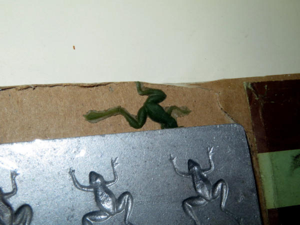 lead mold is 4"x2"; makes 3 frogs that are 1.25" long; has a rubber frog included; sealed in plastic; original sleeve; neat piece