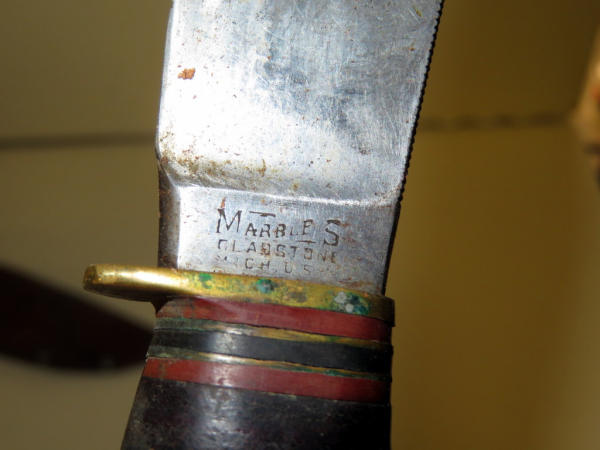 knife has some wear, there is NO BSA logo on the knife; leather sheath has Boy Scouts of America Logo & button is marked Marbles; blade is 4.5" long;