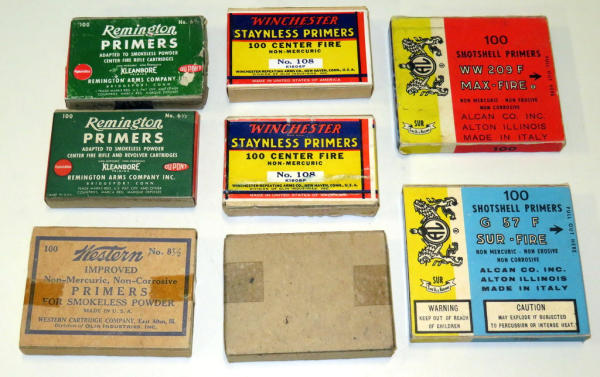 the two Shotshell & plain boxes are partial; the other 5 boxes are still sealed and full; about 750 total primers; sell for one money; NO SHIPPING ON PRIMERS, LOCAL PICKUP ONLY