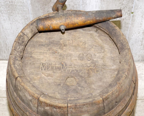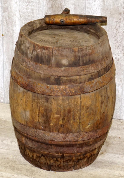 15" across, 20" tall, good lettering on the end, missing the very end metal bands, has some dry rot, barn find original