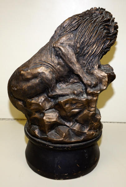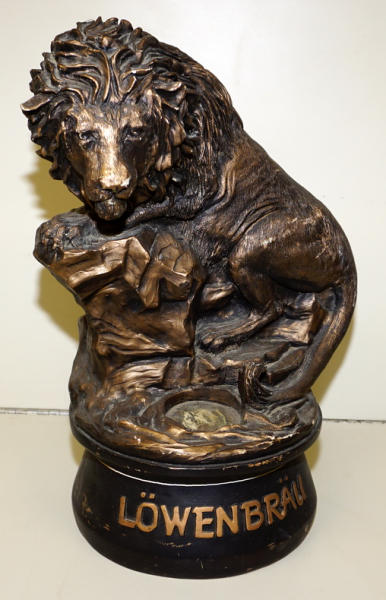 about 17" tall, has some scuffs and scratches, has a spot to hold the bottle, neat piece