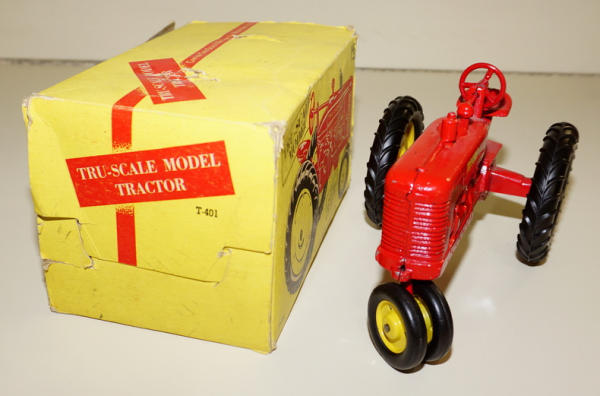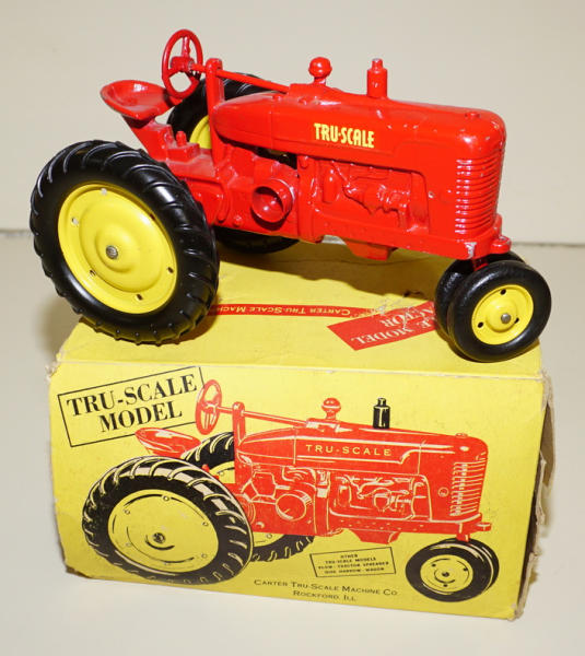 Toy is near mint original, few light paint chips; early version with looped wire drawbar and non-painted grill; Box is fairly rough, missing 3 end flaps and has punctures, rates 6 condition; not the best box, but a really scarce toy, I believe the first tractor produced by Tru-Scale