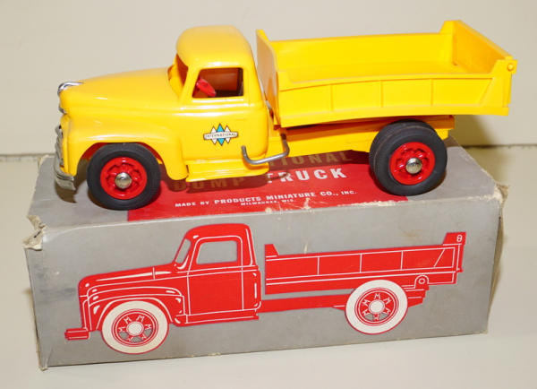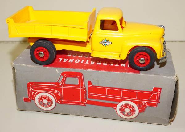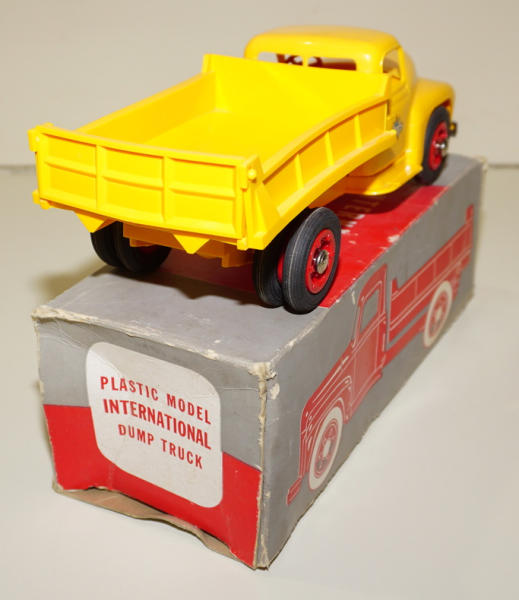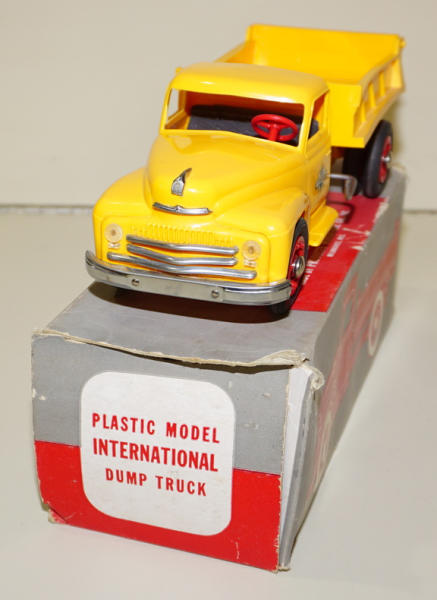 1950's plastic, never played with, but dump bed is a little warped; box is complete with heavy wear, rates 7 condition