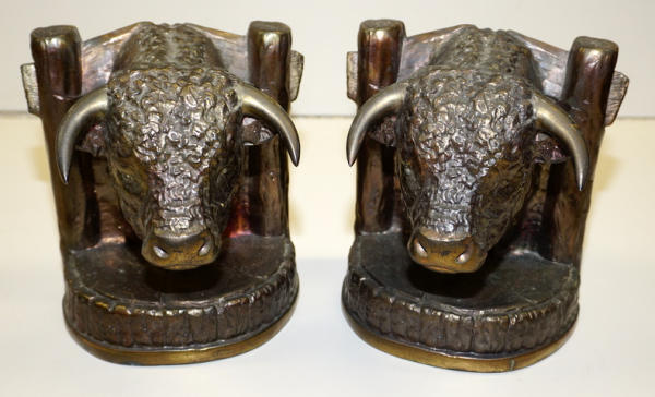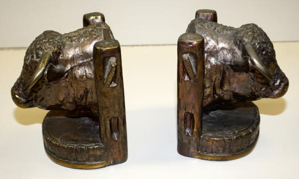 7" tall, 6" wide, made of pot metal with a bronze finish, dated 1947 Glady's Brown, sells as a set, both look to be mint condition