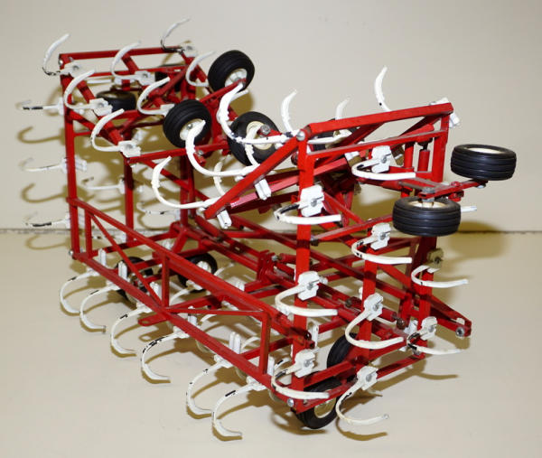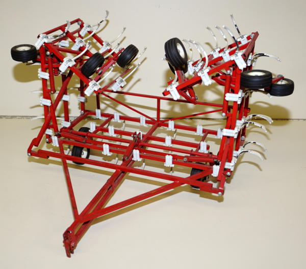 Frame is 100% scratch built from streel and brass; plastic Ertl gangs used that have been painted white; paint is flaking off the bottoms, 38" wide when unfolded! Great looking piece; not marked, but came from the Eymann collection