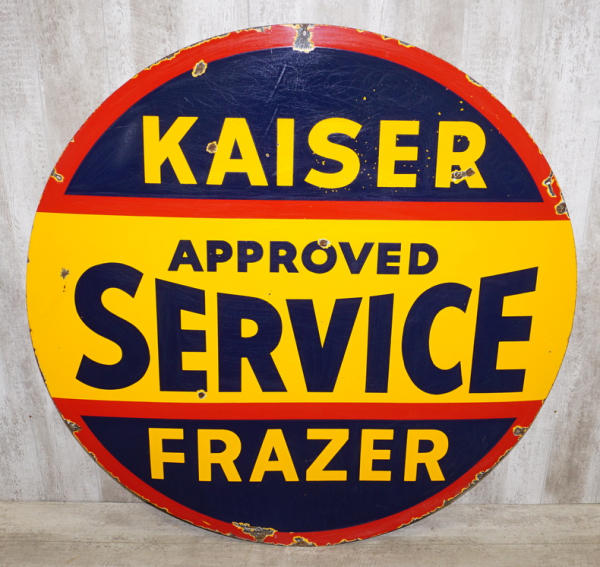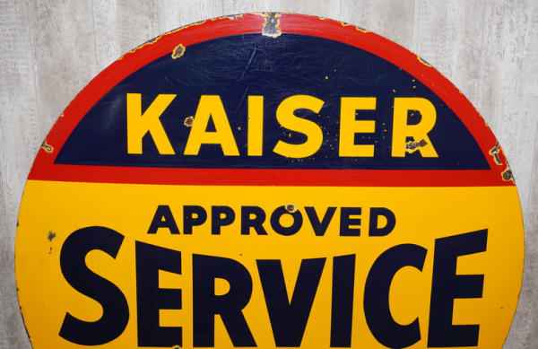 60" diam, very good color, has several small chips and lots of tiny scratches, overall rates 7.5 condition; not perfect, but a really attractive sign