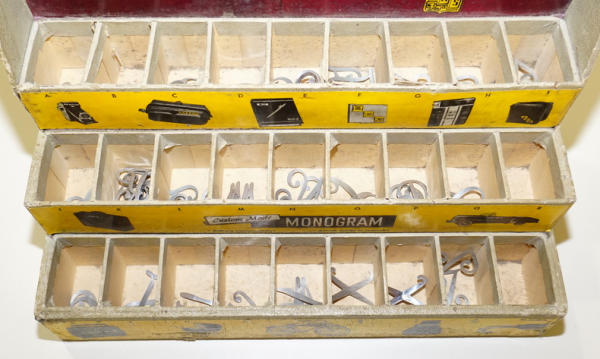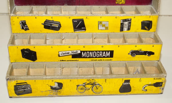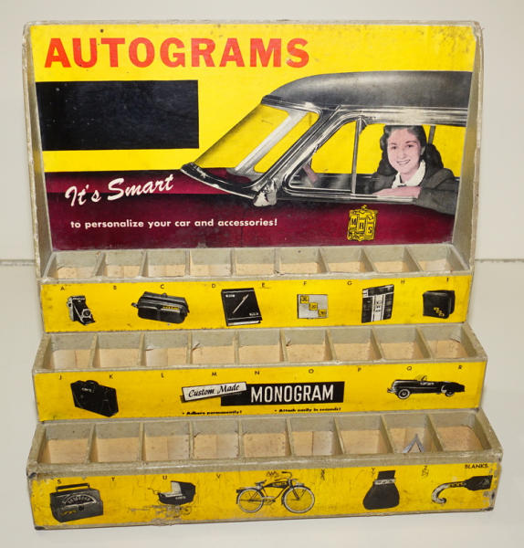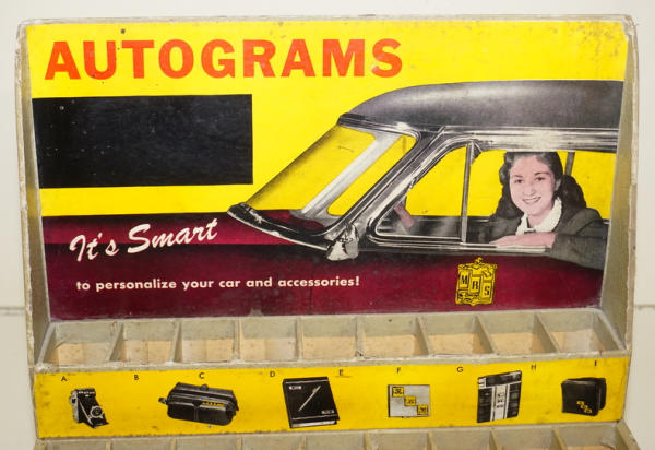 another unique display, 12"x12.5", neat 1950's car graphics, looks to be 50+ 1.25" tall metal monogram letters; not complete, but another really unique display