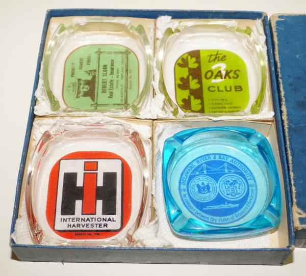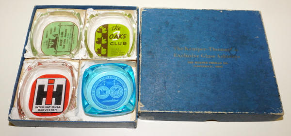 Four 4" glass ashtrays in the original display box, includes a good looking IH one too,, box has some wear, neat set