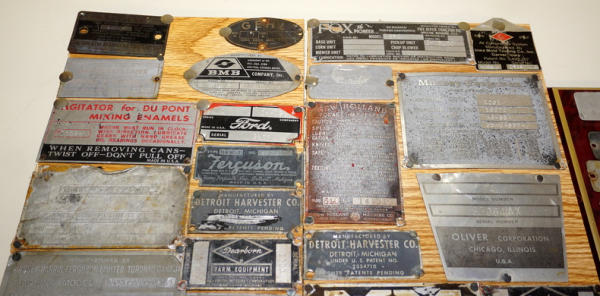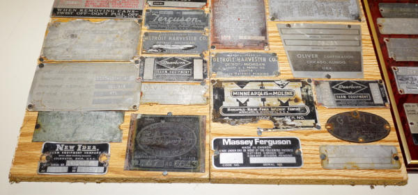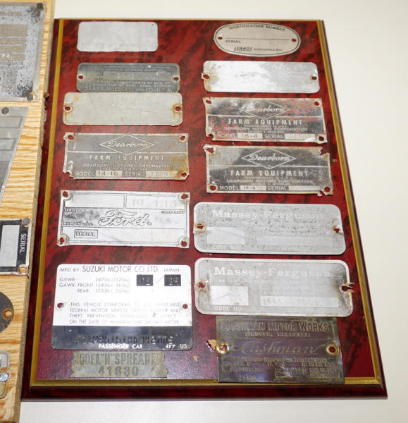 3 small boards full of tags; Jerry did machinery salvage and kept the tags off of pieces, includes Dearborn, Cushman, Ford, Massey & more, all to go for one money