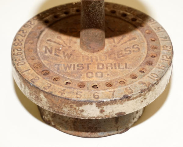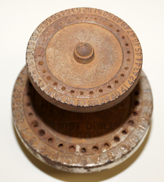 5" tall, about 4.5" across, held some very small bits, originally was nickel plated, but plating is all gone