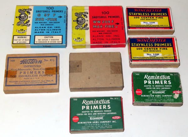 the two Shotshell & plain boxes are partial; the other 5 boxes are still sealed and full; about 750 total primers; sell for one money; NO SHIPPING ON PRIMERS, LOCAL PICKUP ONLY