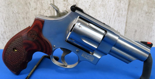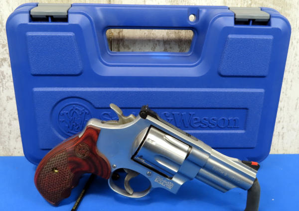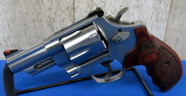 MRE; 3" Stainless Barrel; wood checkered birds head grips; TH; 6-shot swing out cylinder; factory hard case; red ramp front sight w/rear white outline; nice gun; made in USA; SN#DDC2045