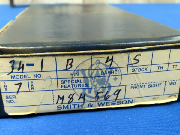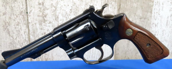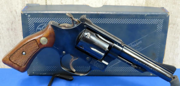 MRE; 4" BBL; 6-shot swing out cylinder; original box; checkered wood grips; used, has some bluing loss on part of the cylinder; made in USA; SN#M84569