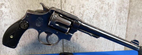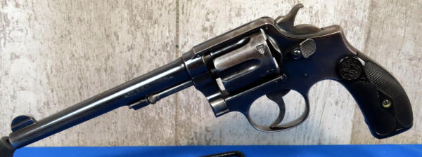 GWE; 6.5" BBL; bluing is thin; plastic checkered grips; 6-shot swing out cylinder; marked "US Service CTG's" on left side of barrel; made in USA; SN#45484
