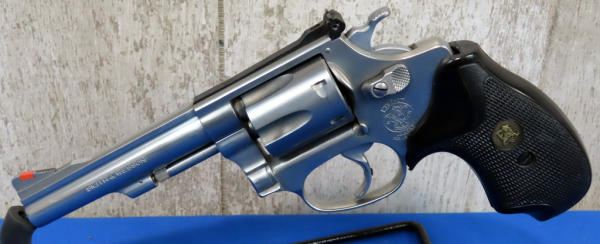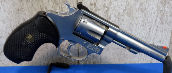 MRE; 4" Stainless Barrel; checkered Pachmayr grips; red ramp front sight; 6-shot swing out cylinder; used; made in USA; SN#BKN5567