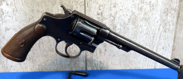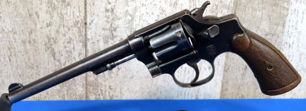 GWE; 6" BBL; 6-shot swing cylinder; bluing is dull and thin; wood checkered grips have wear; made in USA; SN#989682
