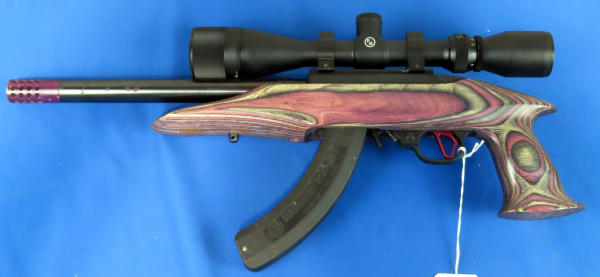 RME; 10" BBL w/2" muzzle break; high capacity magazine; purple wood grain laminate stock; has some rusting on barrel; FM 3-12x40 scope; made in USA; looks like a 10/22 receiver and uses the same magazines; SN#490-26211