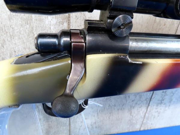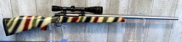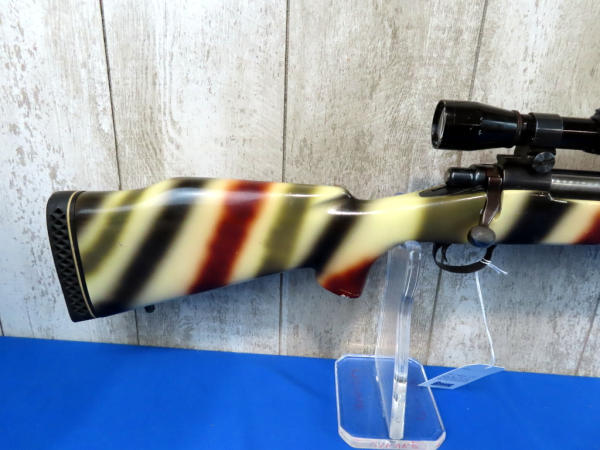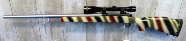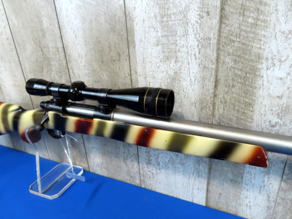 26.5" Heavy Stainless Backer Barrel; after market target trigger added; NO SAFETY, was removed in order for the trigger to operate and fit; smooth action; thick camo painted stock; Leupold Scope; this gun was on our Feb. auction but missed that the safety was removed when we cataloged it, so we are reselling it properly described; only said this gun is extremely accurate; SN#6264381