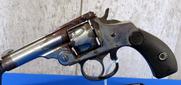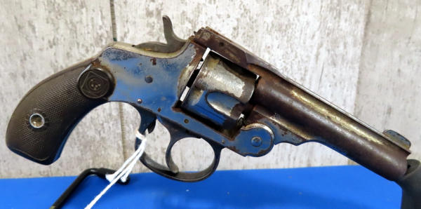 LSC; 3-1/8" barrel; nickel finish is flaking; action works but top break latch is broke; rough condition; no SN#; no transfer needed