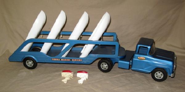 original paint is about 85-90% condition, boats are nice replacements, Scott-Atwater style motors, 1 is original and damaged, other is a repop, nice set