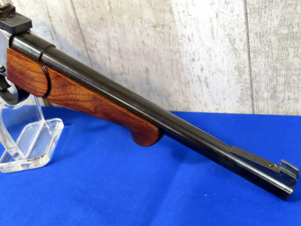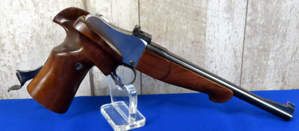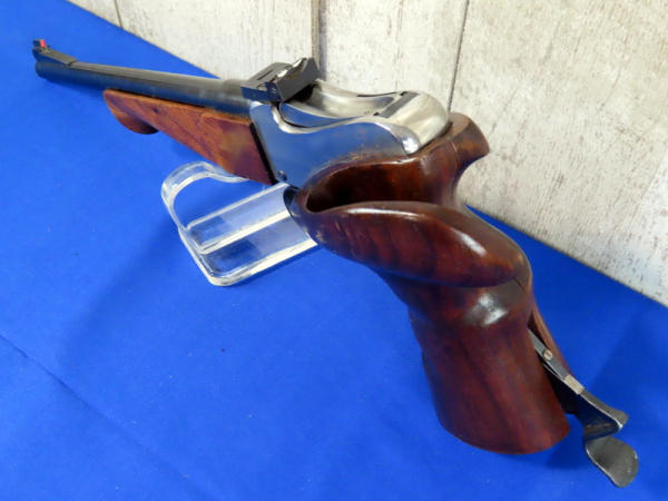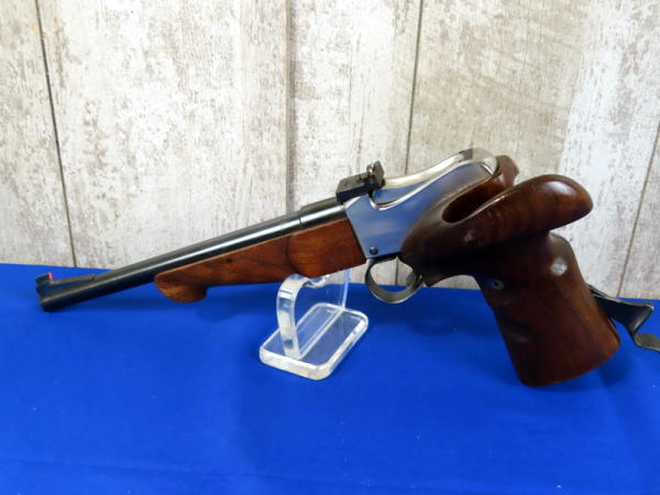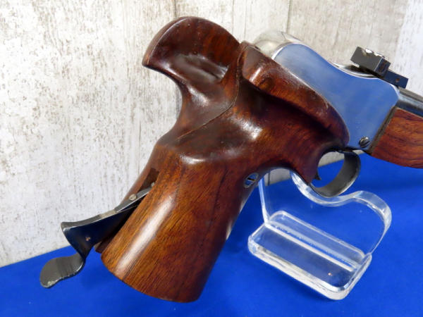 BLE; nice; looks like a BSA receiver; large custom wood target grips; single shot; receiver opens from lever on bottom of grip; neat looking firearm; there's no maker mark, SN# or marks of any kind; No transfer needed