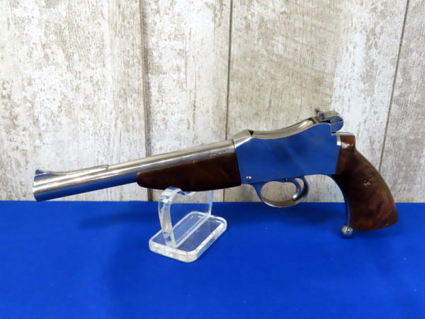 BLE; nice; 8" nickel barrel; easy break action; minor spotting on receiver; wood grips; no SN#