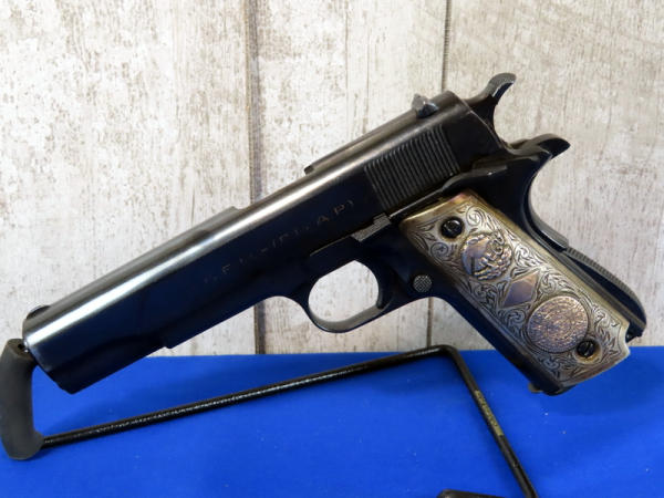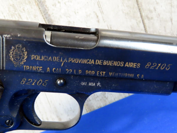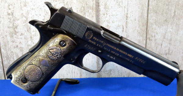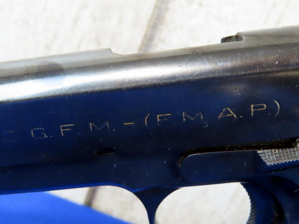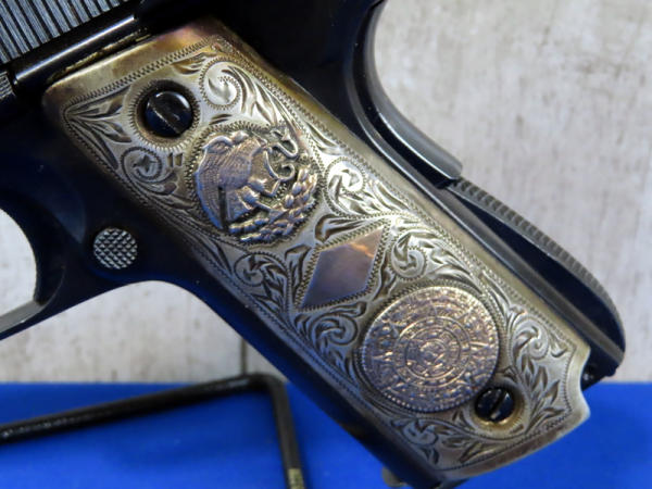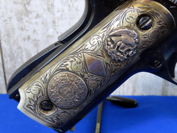 BLE; nice; very high detailed and beautiful metal grips; nice bluing; has some use wear; one magazine; import marked; Police issued in Brazil?; neat looking pistol; SN#82105
