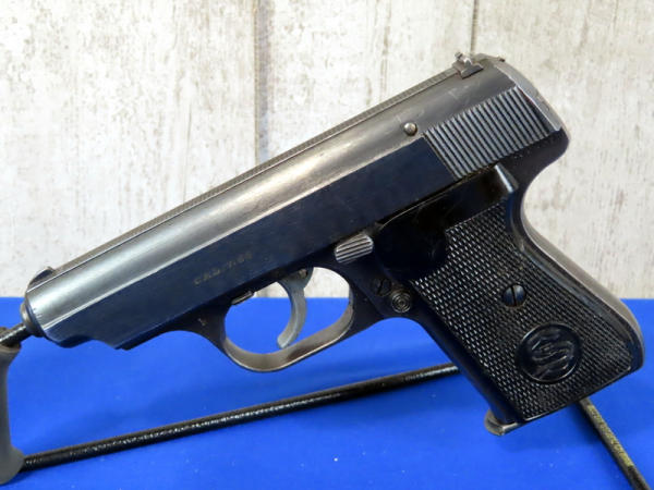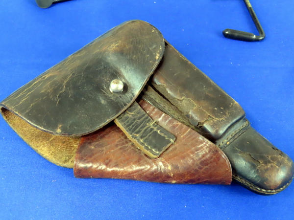 BLE; used; 3-3/8" BBL; needs a good cleaning, has some spotting; plastic checkered grips; period correct leather holster; one magazine; SN#506468