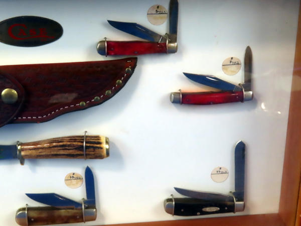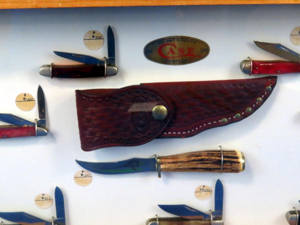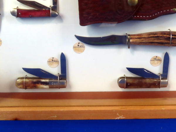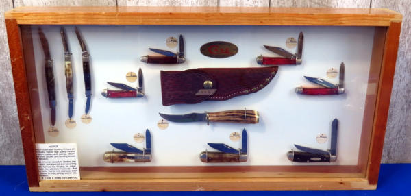 BLE; all knives look mint & new; comes in wood frame box w/glass top; wired in; Bernie was a Case knife dealer; probably something he sat on the table at shows to display what he had available; measures 24"x12"; No Shipping, local pickup only