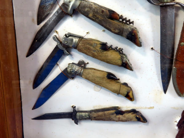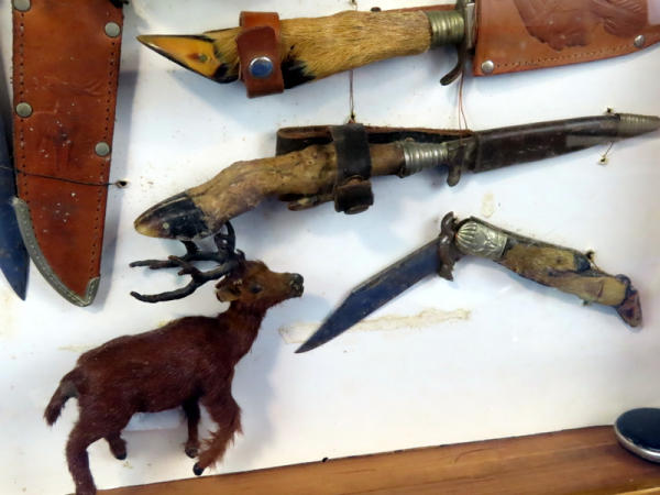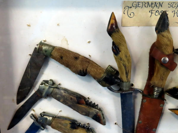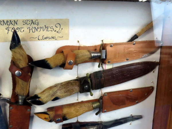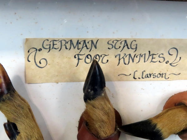 BLE; very unique collection of knives; all made with real stag foot for the handles; some are alittle loose and may need to be readjusted on the board; 25"x19"; wood frame w/glass face; NO SHIPPING, local pickup only