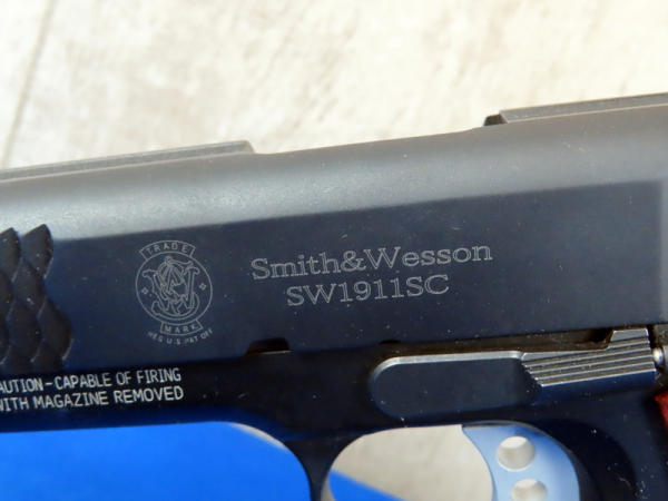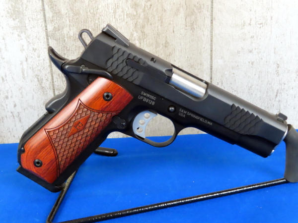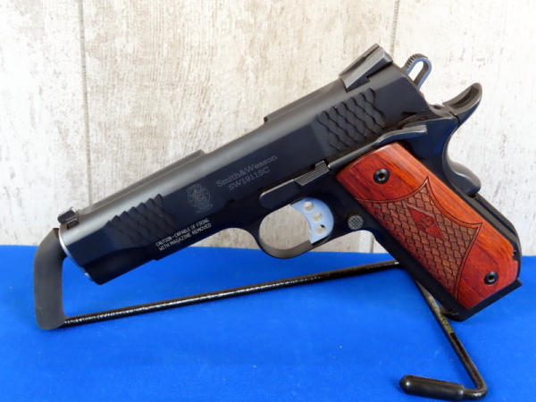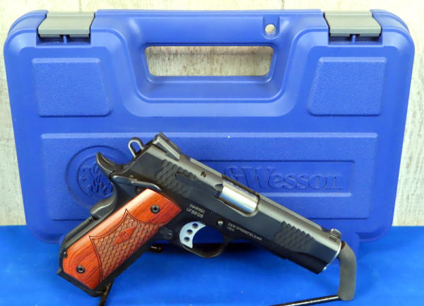 4-1/8" stainless Barrel; appears new & unfired; night sights; E-Series wood grips; has "fish scale" design on grips & slide; 2-magazines; factory hard case; made in USA: SN#UFB8128