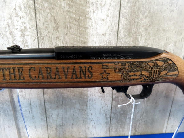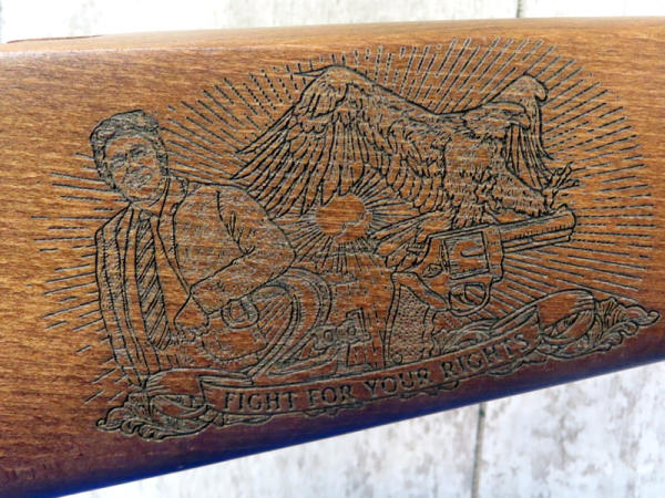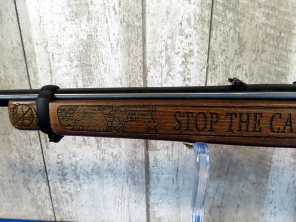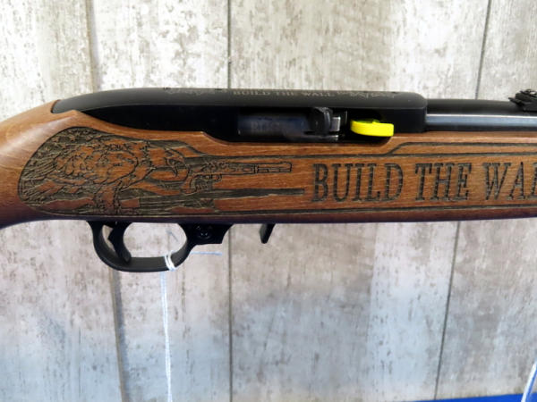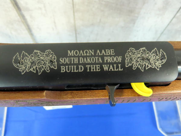 Mint & unfired; highly engraved wooden stock; "Build the Wall Now", "Fight for Your Rights", "Stop the Caravans" & "South Dakota Proof - Build the Wall"; 18.5" BBL; removable magazine; original box; made in USA: SN#0014-00130