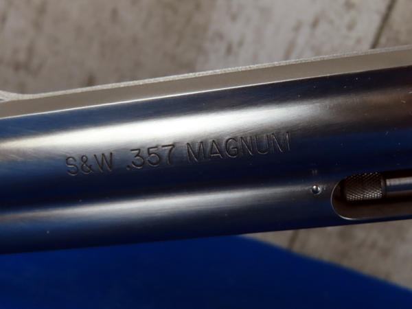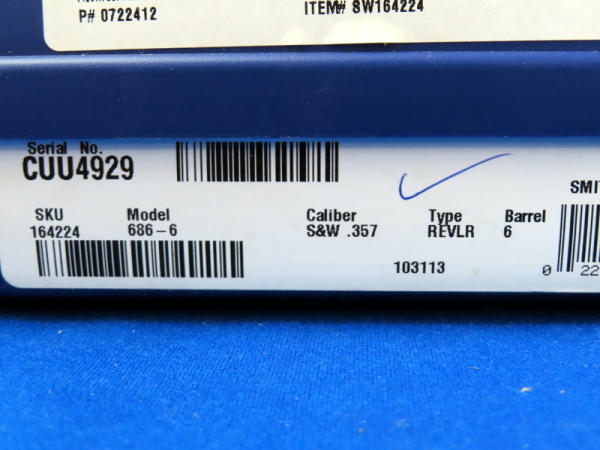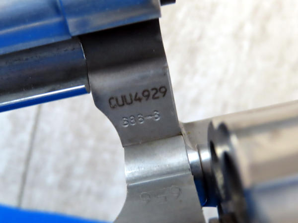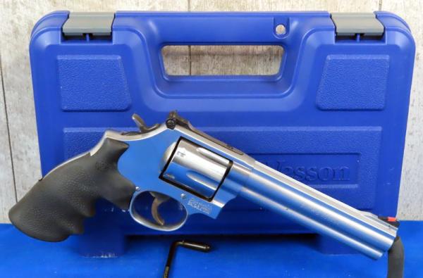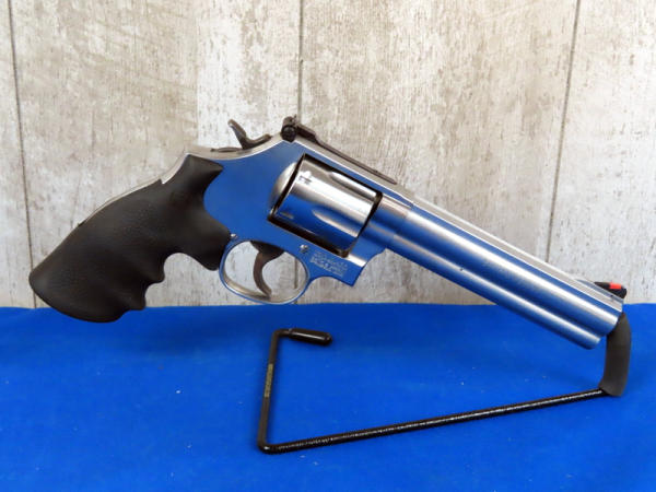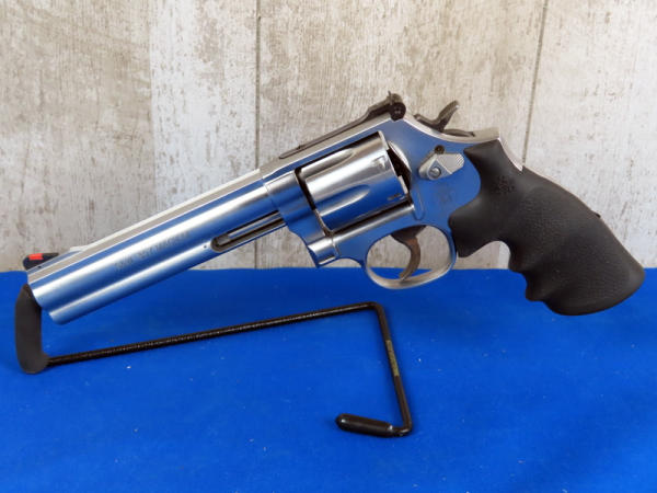 6" Stainless barrel; rubber finger groove grips; red ramp front sight w/rear white outline; used; 6-shot swing out cylinder; factory hard case; made in USA; SN#CUU4929