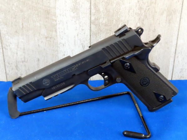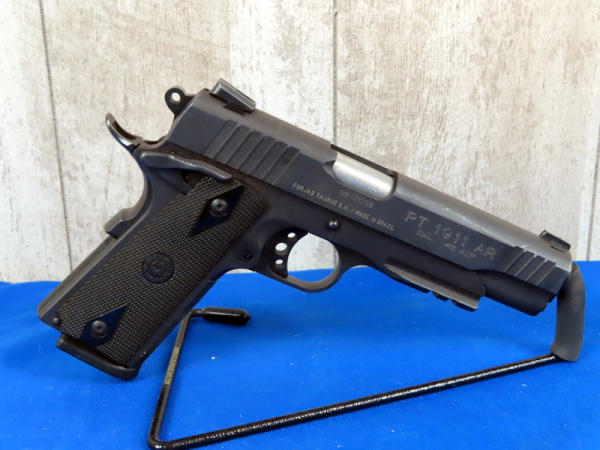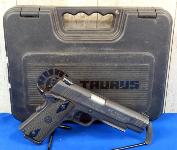 5" Stainless Barrel; used; night sights; factory hard case; 2-magazines; holsters; hard rubber checkered grips; has some light scratches on slide; made in Brazil; SN#NBV55256