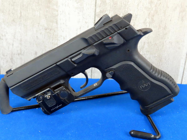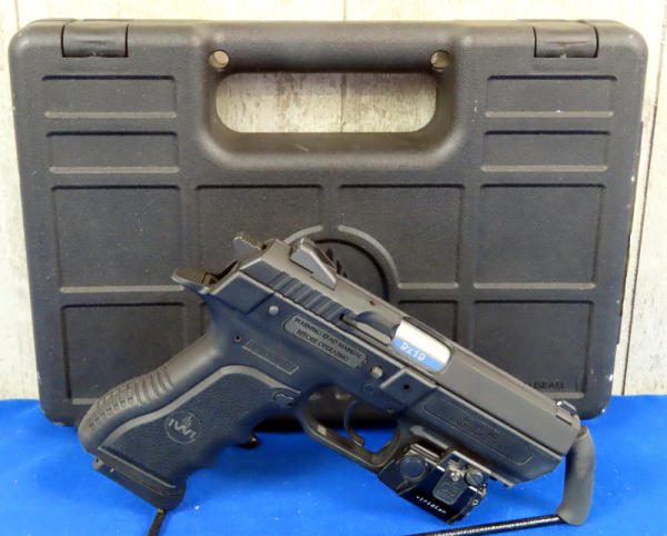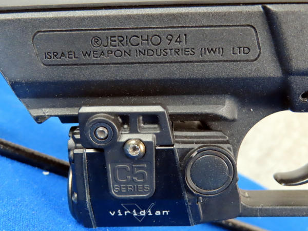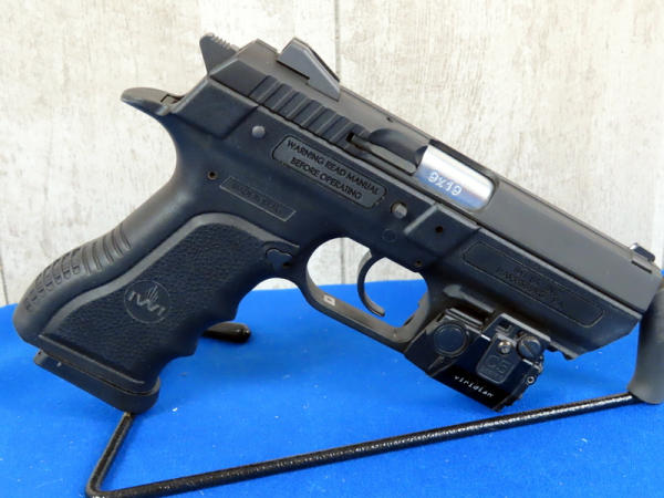 3-7/8" Stainless barrel; Viridian C5 Series laser sight, could not get to work, probably needs a battery; factory case; 2-magazines; made in Israel; black synthetic frame; night sights; nice gun; SN#J0001902