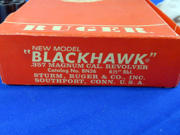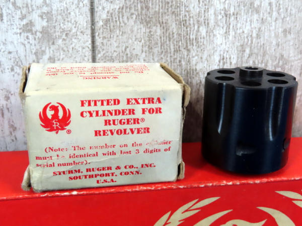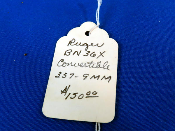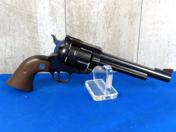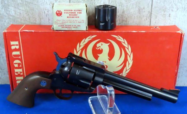 PJE; 6.5" BBL; includes two 6-shot fixed cylinders, there's a tag inside box that reads "Ruger BN36X Convertible 357-9mm", neither cylinder is marked, so not sure what is what; used; front sight painted orange; wood grips; original box; made in USA; SN#33-64876