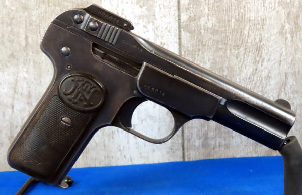 mfg. 1900-1914; 4" BBL; original hard rubber checkered grips; numbers matching; has some bluing loss; made in Belgium; SN#590814