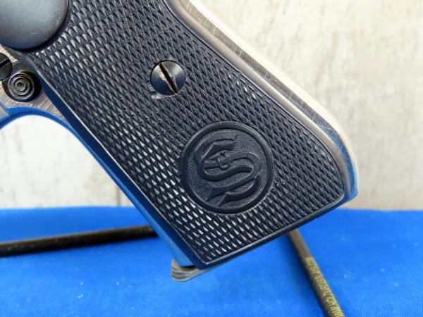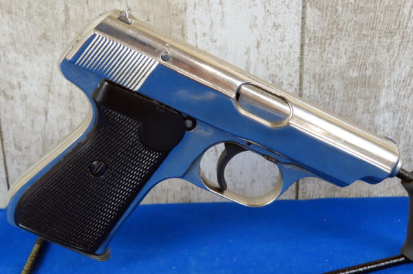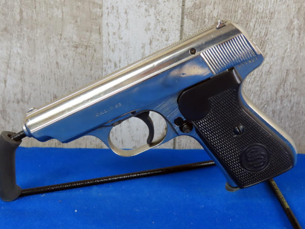 believe this is a Sauer, looks a lot like a Walther; 3-3/8" barrel; looks like a nickel finish; plastic checkered grips; one magazine; no make or model marks; SN#511801
