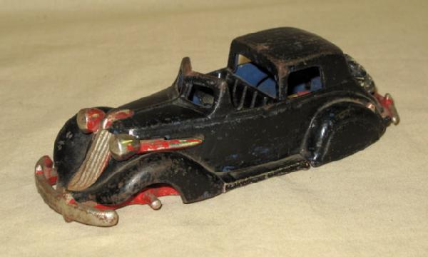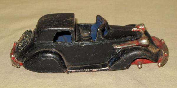 no wheels, poor old repaint, good casting except for small tip on the frame that comes through by the trunk, has the "S" in the spare tire, rare toy to restore