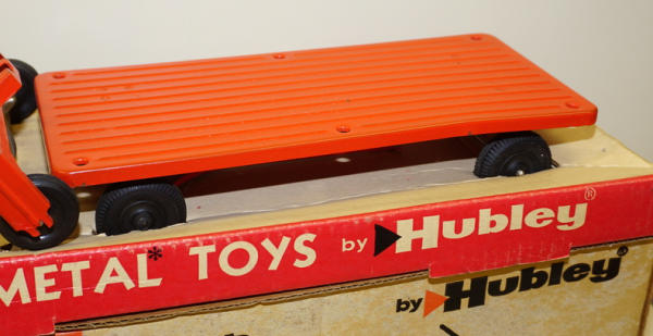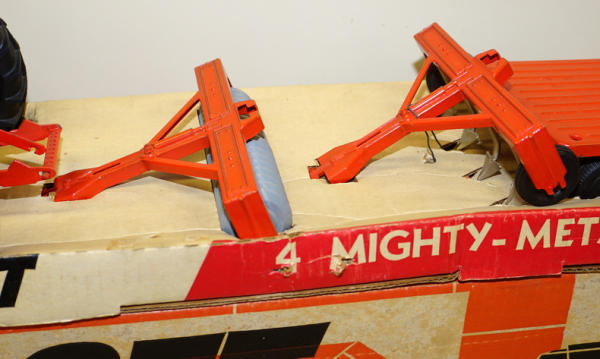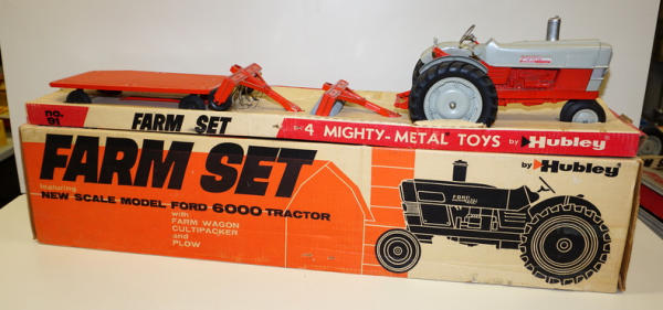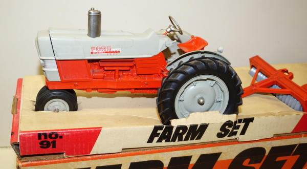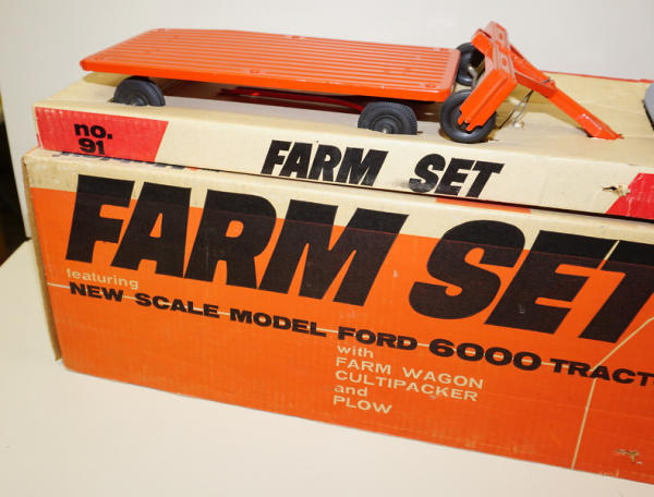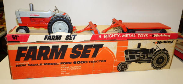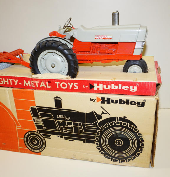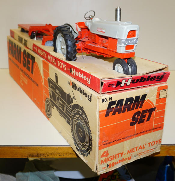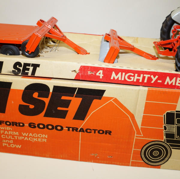 1/12th scale set by Hubley. Tractor has 3pt hitch and metal rims and near mint condition, diecast implements are near mint too, toys are wired into the base box, box has some general wear and ageing, but not bad, I rate the box at 8 condition; I think this is only the 2nd one of these we have seen in 20+ years of selling farm toys!