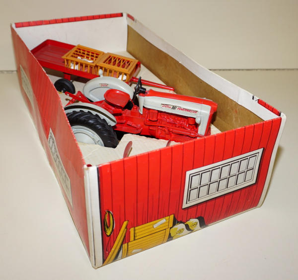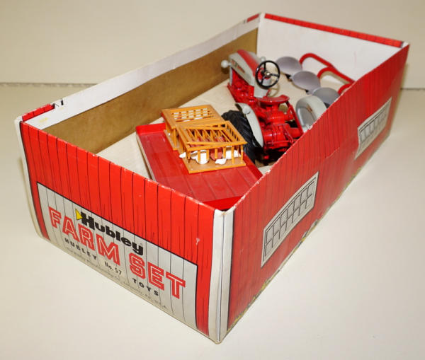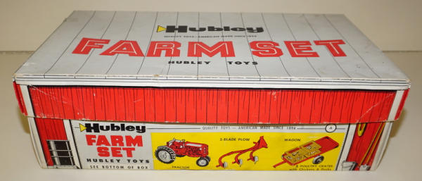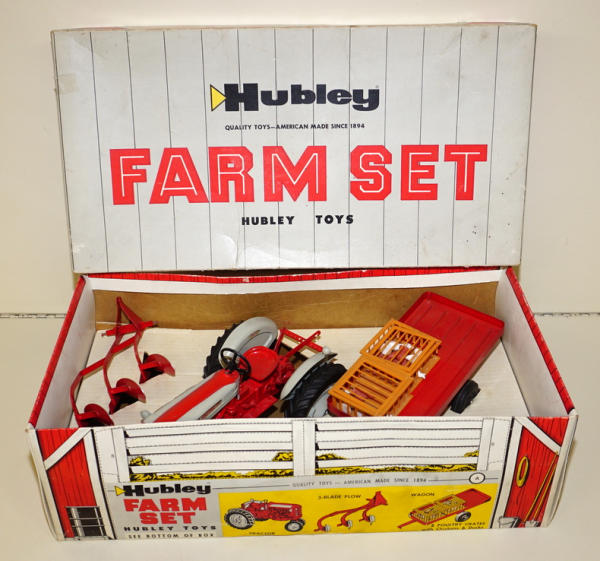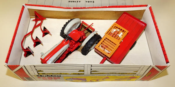 1/12th scale set by Hubley, Tractor is nf version with 3pt, includes 3b plow, trailer, and 2 crates of chickens; one crate is damaged, otherwise toys are all mint condition, has good original box liner, outside box is nice and clean with some minor edge wear, box overall rates 8.5 condition