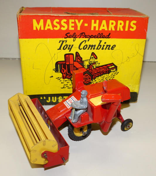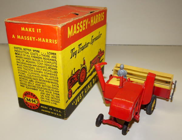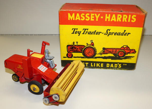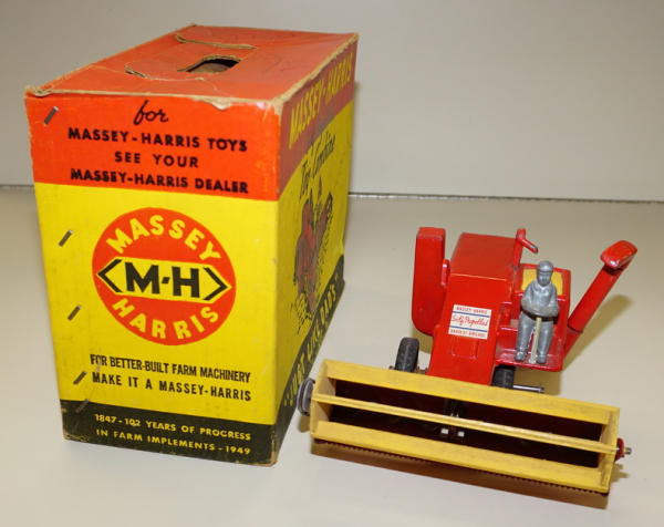 nice toy with some light wear, same as the previous lot, but a different box; box is complete, has some general wear; they used the same box for the combine & the farm set, no box liner, box has some writing on the top, box rates 8 condition